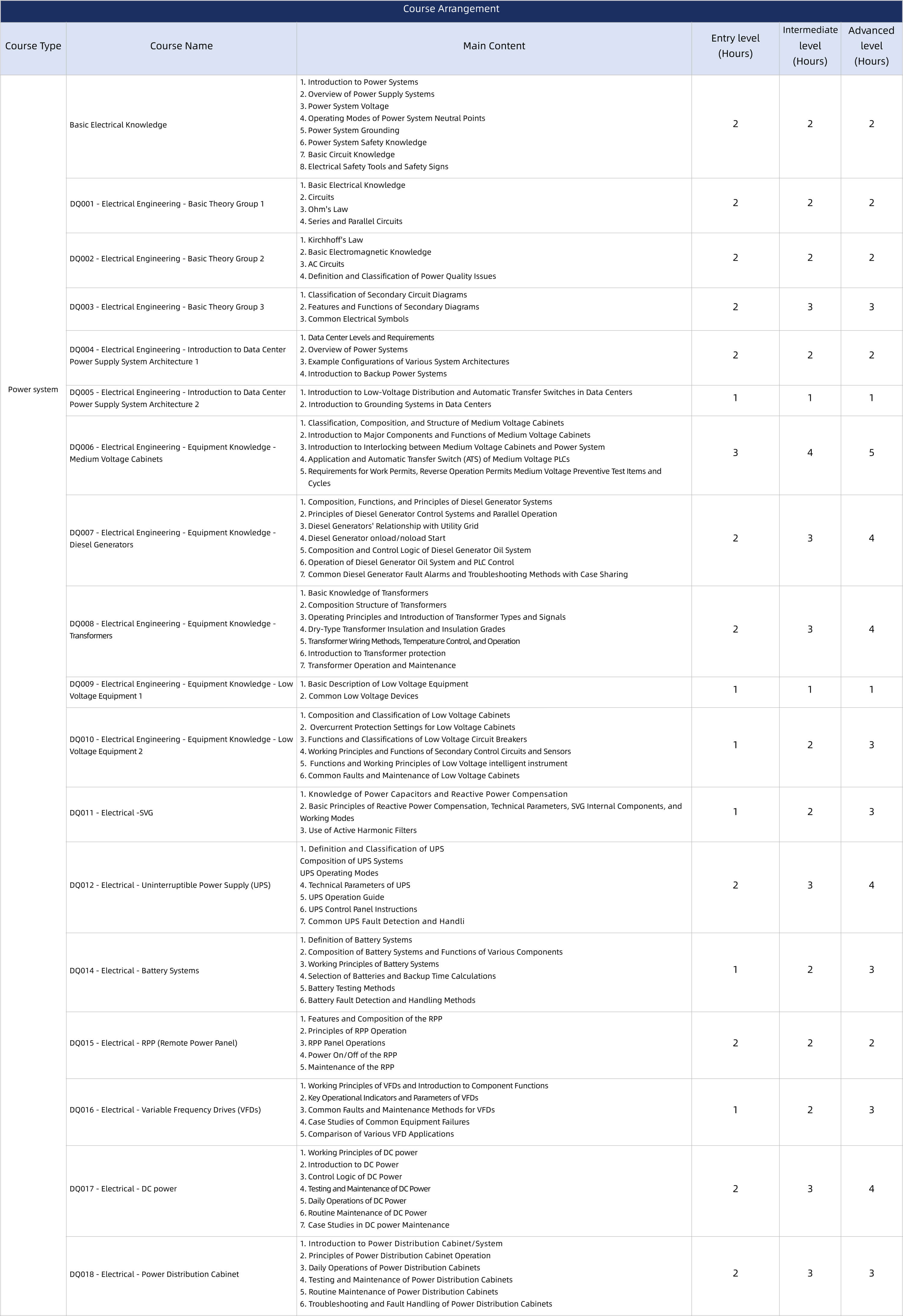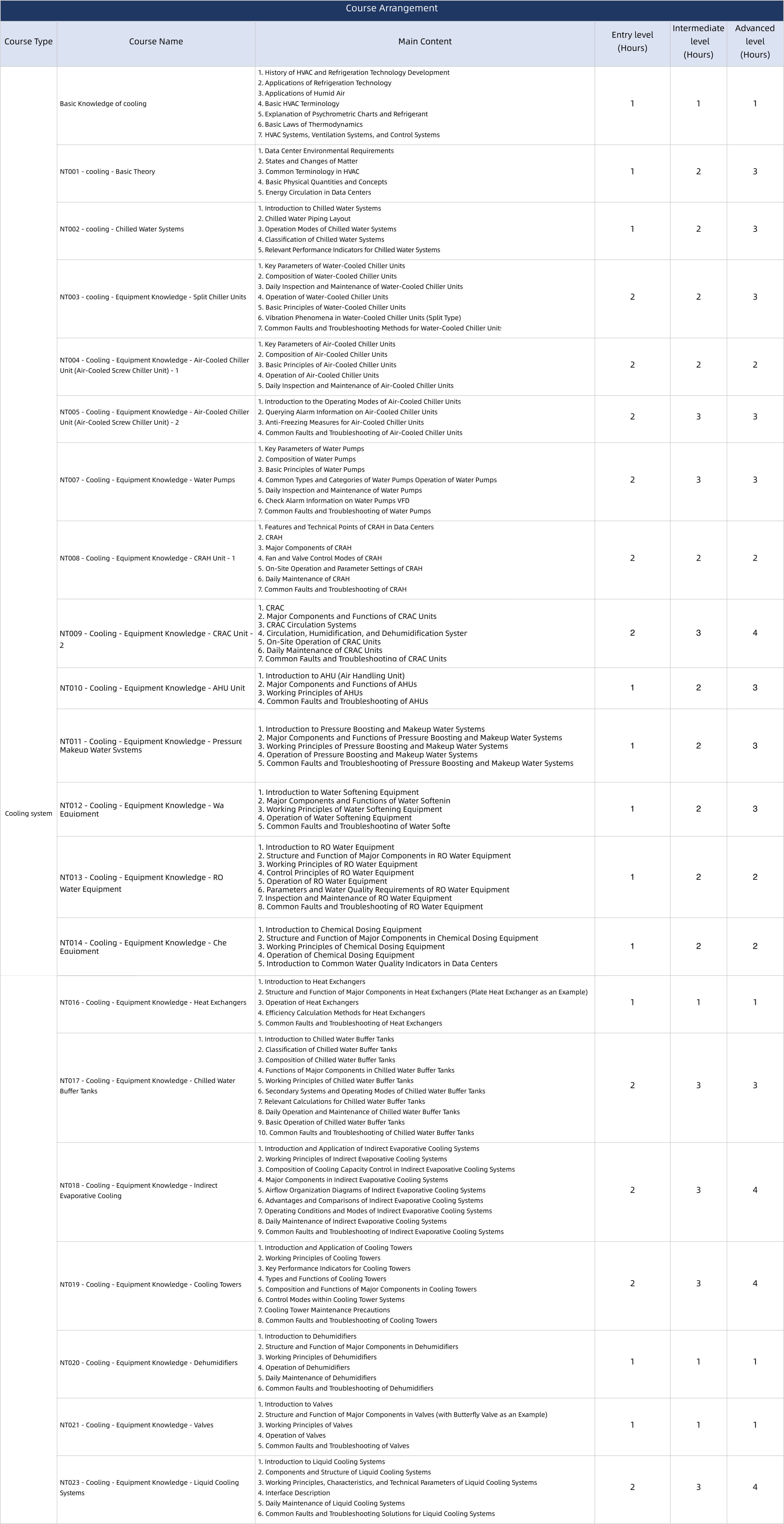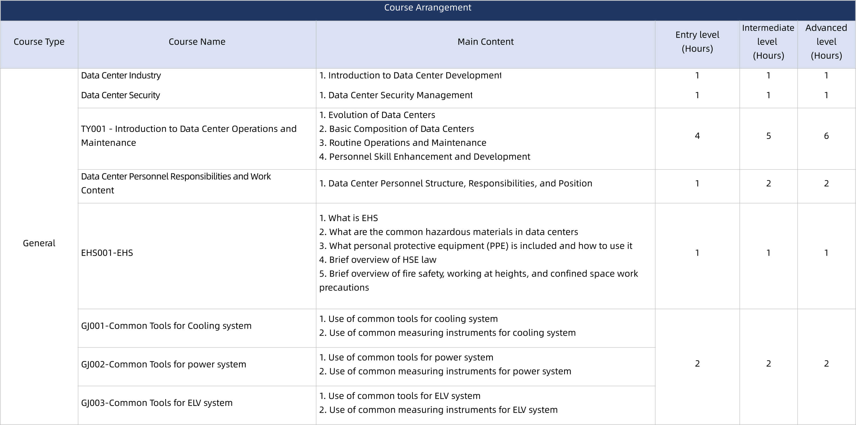 Through this training, participants will gain a profound understanding of data center operations and maintenance (0&M) functions, acquiretechnical capabilities in data center O&M, and master 0&M processes. Graduates who pass the assessments wil be qualfied to work in datacenter O&M roles.